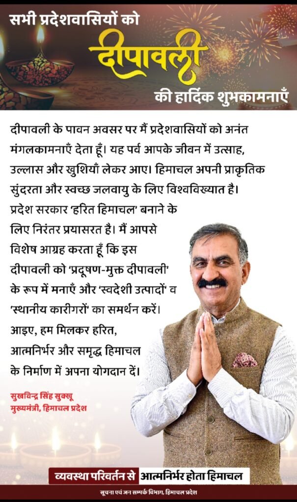 मुख्यमंत्री ठाकुर सुखविंद्र सिंह सुक्खू ने प्रदेशवासियों को दीं दीपावली की शुभकामनाएं